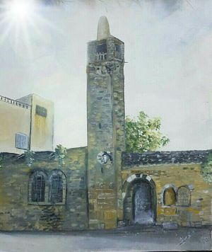 مدخل مسجد أبو لبادة مع المئذنة. لوحة زيتية بريشة الفنان عثمان الدريعي، 2017 |