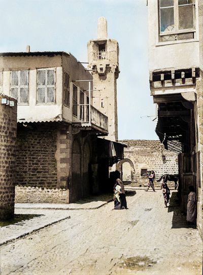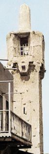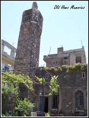 | مدخل مسجد أبو لبادة مع المئذنة. من مجموعة المهندس عبد الرزاق التركماني، صفحة ذكريات حمص القديمة |