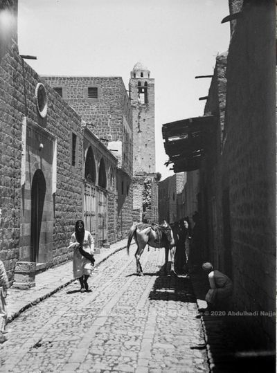 ![]() مئذنة ومدخل مسجد الفضائل من ناحية الجنوب قرب مدخل بيت عبد الله فركوح، حي بستان الديوان. من صفحة المهندس عبد الهادي النجار، 1919 |
