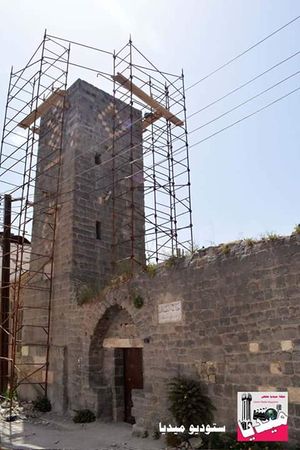 ![]() مسجد الفضائل، المئذنة أثناء الترميم. من صفحة مساجد مدينة حمص. تاريخ غير معروف. |